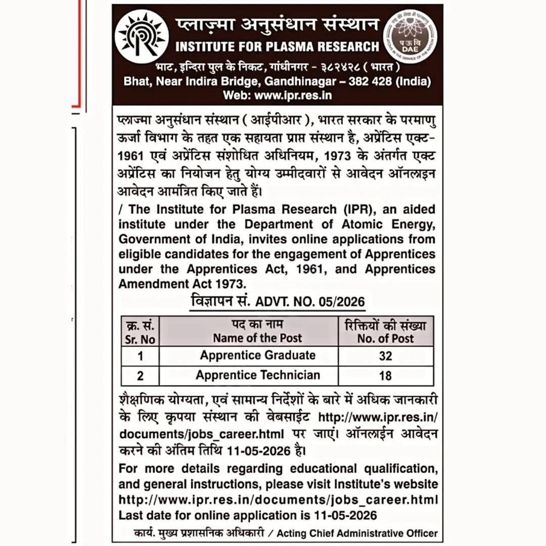 The Institute for Plasma Research (IPR), an aided institute under the Department of Atomic Energy (DAE), Government of India, located in Gandhinagar, has released an official notification for the engagement of Apprentices for the year 2026. This recruitment drive aims to fill 50 vacancies for Graduate and Technician Apprentice positions under the Apprentices Act, 1961, and Apprentices Amendment Act 1973.